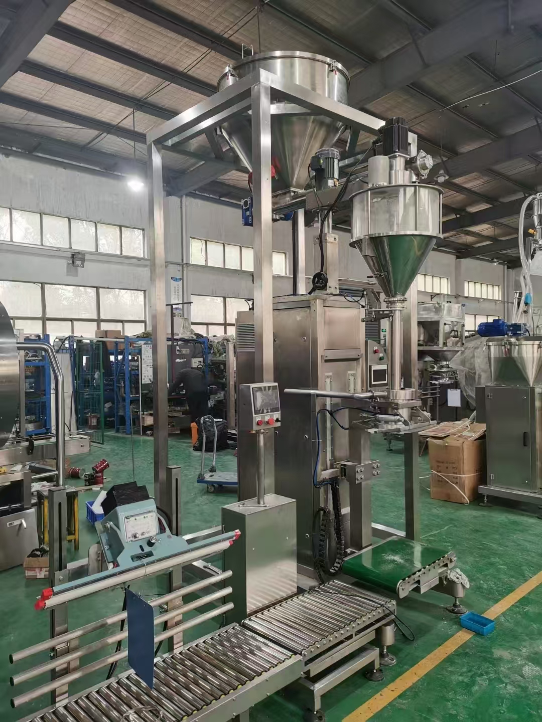 9、包裝秤使用過程:人工協助上袋,自動稱重、夾袋、充填,經輸送帶傳遞進行自動封口或縫包